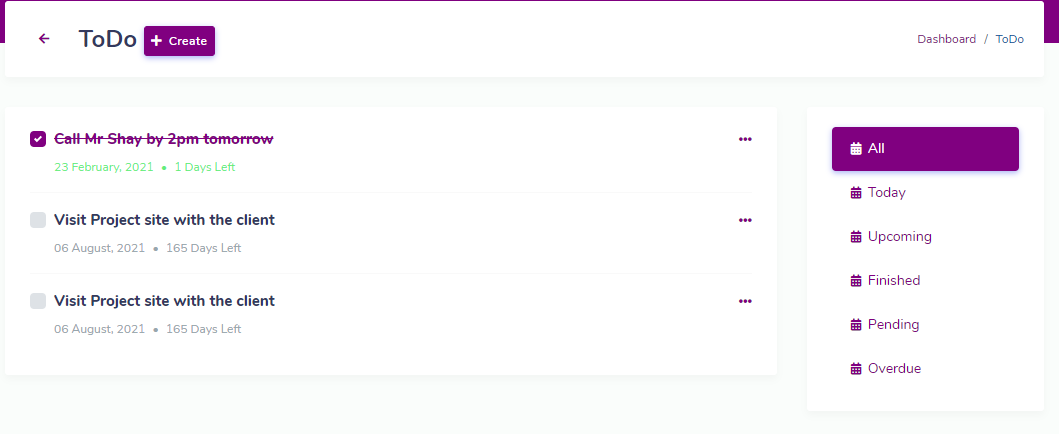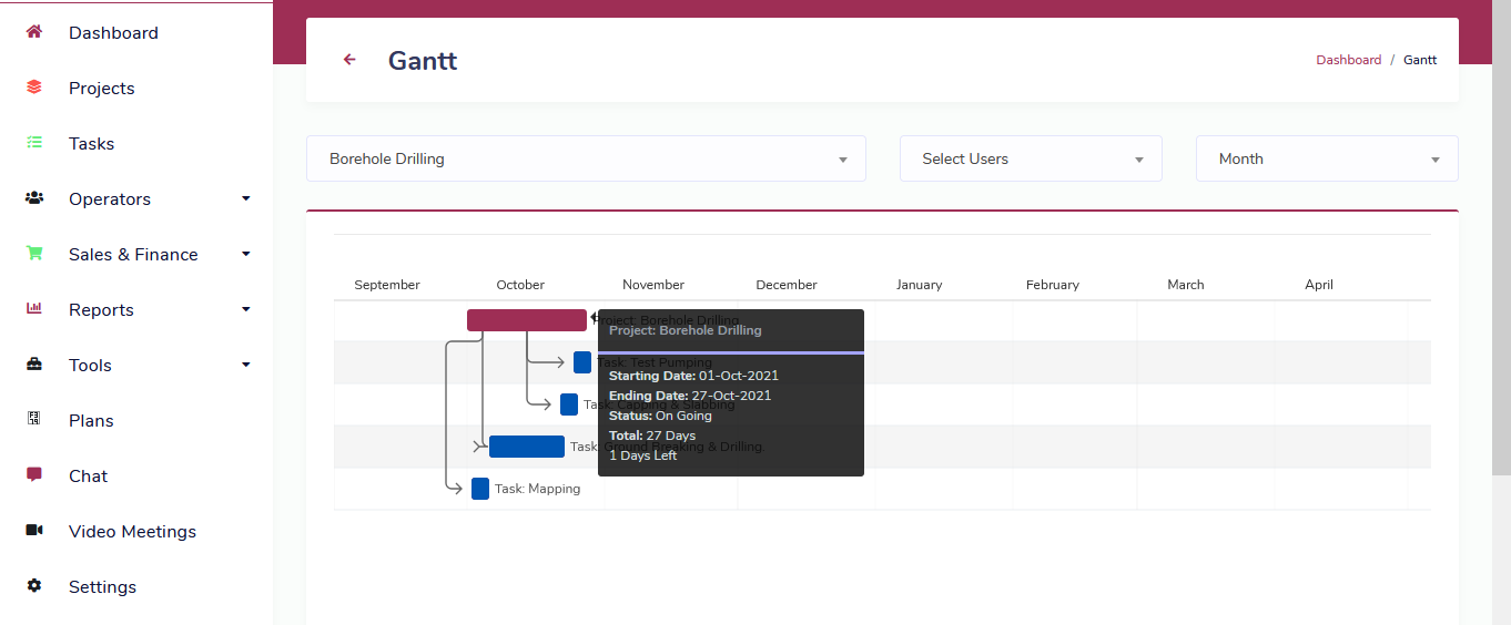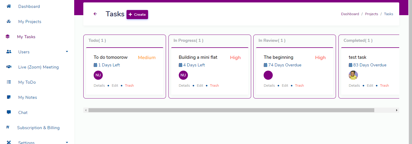 Create unlimited number of Projects (programs) with start and end date of each project and with its own unique team. You can easily assign team member and client to each project. You can create tasks for the project and assign those tasks to the project team members in order to get tasks done. You can also see all the details about the project such as graphical overview, project tasks, project statistics, project files, project users, and many more