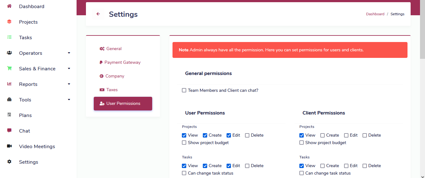 Admin has the power to give any permission to any team member. Permissions includes view projects and tasks, update, delete, and many more. He also sets the company information, online payment information and taxes.